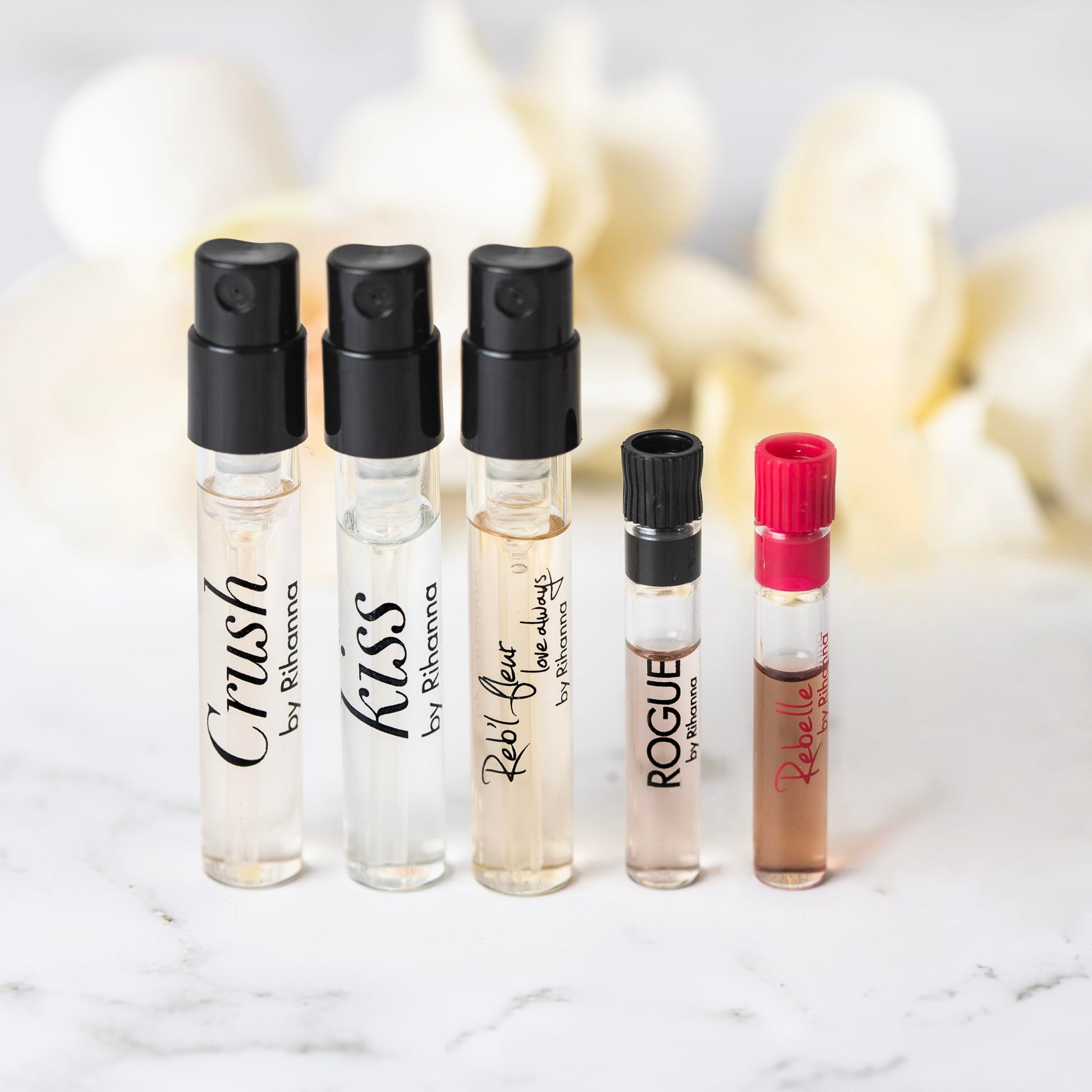 - Quantity: 5 vials / 0.03-0.05 oz - You will receive 5 Rihana women's perfume sample vial bottles - Crush, Reb'l Fleur, Kiss, Rogue, Rebelle.